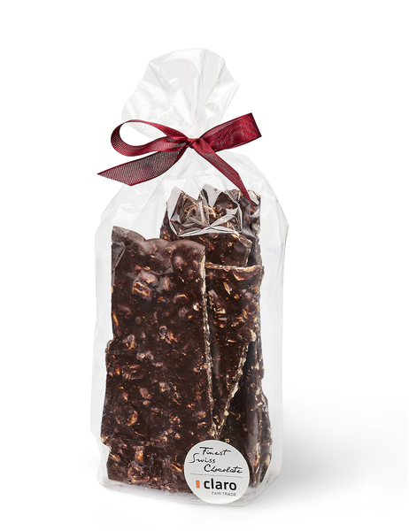 Dunkle Schokolade von feinster Qualität aus Ghana trifft auf knusprige, karamellisierte Haselnusssplitter. In Handarbeit in der Confiserie von Emmentaler Backwaren veredelt, entsteht ein intensives Geschmackserlebnis: zart schmelzend auf der Zunge, mit unwiderstehlichem Crunch in jedem Stück. Perfekt für Schokoladenliebhaber, die das Besondere schätzen – ob als edles Geschenk oder zum selbst Geniessen.