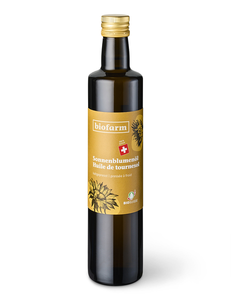 Als Alleskönner ist Sonnenblumenöl in jeder Küche gern gesehen. Der abgerundete, nussige Geschmack verfeinert Salate aller Art und eignet sich auch hervorragend zum Dünsten. Das milde Öl enthält viele sekundäre Pflanzenstoffe und Vitamin E. Die Bio-Sonnenblumen gedeihen in warmen, sonnenreichen Schweizer Regionen und sind speziell während ihrer Blüte eine Augenweide. Die ölreichen Kerne werden traditionell mit ihrer Schale kalt gepresst.