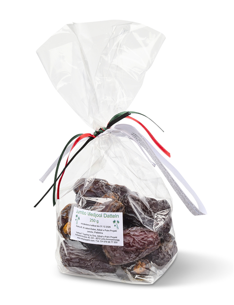 Orientalischer Superfood-Genuss der Extraklasse: Unsere naturbelassene Jumbo-Medjool-Dattel aus Palästina ist die Königin unter den Datteln: gross, weich und verführerisch aromatisch mit natürlicher Vanille- und Caramel-Note. Dank der aufwendigen Erntemethode, bei der die Früchte bis zur vollen Reife an der Palme bleiben, entfalten sie ihr volles Aroma – ganz ohne künstliche Behandlung. Mit jedem Bissen unterstützt du faire Arbeitsplätze, nachhaltige Anbaumethoden und ein Projekt, das Mensch und Umwelt gleichermassen guttut.