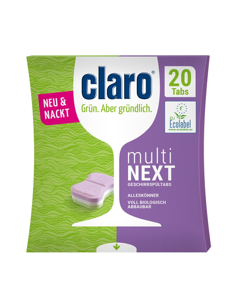 Les tabs innovants claro Multi Next NAKED sont la prochaine grande étape dans le nettoyage écologique de la vaisselle. Sans aucun film plastique - simplement une puissance de nettoyage pure sous sa forme la plus naturelle. Les tabs sont "nus", mais avec une efficacité totale : les fonctions de sel et de rinçage intégrées et la protection écologique de l'argent garantissent une vaisselle éclatante de propreté - sans aucun compromis. L'emballage est composé à 100% de papier à base d'herbe.